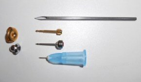 美容クリニックで、耳ピアスやボディピアスの穴あけに使用する麻酔針の大きさはとても細いです。比較のために、写真をご覧ください。上からボディピアス用の14ゲージのニードル、他院で使われることの多いピアスガンによるファーストピアス、当院で主に使用しているインバネス社のニードル型ファーストピアス、そして最下段が麻酔針です。とても細いですので刺してもほとんど痛くありません。